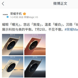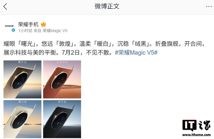 荣耀 Magic V5 折叠屏手机四配色外观公布,含「曙光」「敦煌」「暖白」「绒黑」