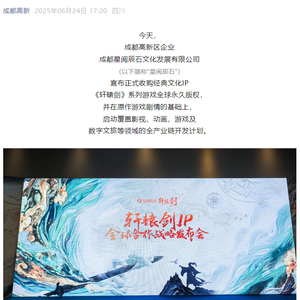 此外,星阅辰石宣布与新美集团签约,双方将整合资源共同开发“轩辕剑”IP 全系列版权,围绕《轩辕剑叁:云和山的彼端》《轩辕剑叁外传:天之痕》等核心作品,拓展文学、动漫、影视、游戏及衍生消费品矩阵。