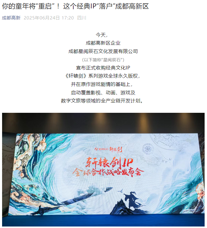 IT之家 6 月 24 日消息,成都高新区企业“星阅辰石文化发展有限公司”今日宣布收购经典 IP《轩辕剑》系列游戏全球版权。
