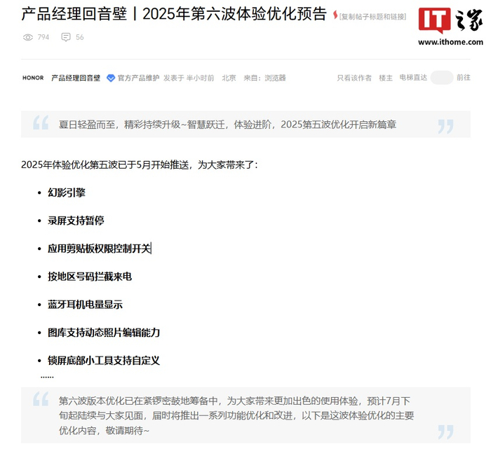 IT之家附荣耀 MagicOS 系统 2025 年第六波体验优化预告如下: