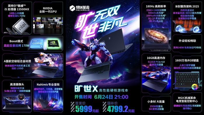 IT之家 6 月 24 日消息,机械革命刚刚宣布,旷世 X 新品首发 RTX 5050 独显,官方定价 5999 元,叠加国补后 4799.2 元,今晚 21:00 开售。