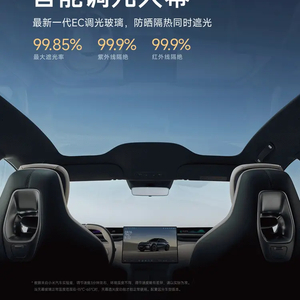 据介绍,智能调光天幕采用最新一代 EC 调光玻璃,最大遮光率 99.85%、紫外线隔绝 99.9%、红外线隔绝 99.9%。