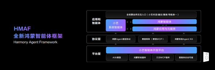 为加快应用与智能体的深度融合,华为首次推出了鸿蒙智能体框架HMAF(Harmony Agent Framework)。其中,平台层中的小艺智能体开放平台,还为开发者提供了50+鸿蒙系统插件、兼容MCP工具,支持全场景智能体协同,实现一站式高效开发。
