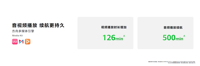 此外,依托方舟调度引擎,HarmonyOS对应用进行全流程加速,实现了秒启秒开秒加载;得益于方舟多媒体引擎,音视频播放续航更持久,视频播放时长也增加126分钟,音频播放续航增加500分钟。
