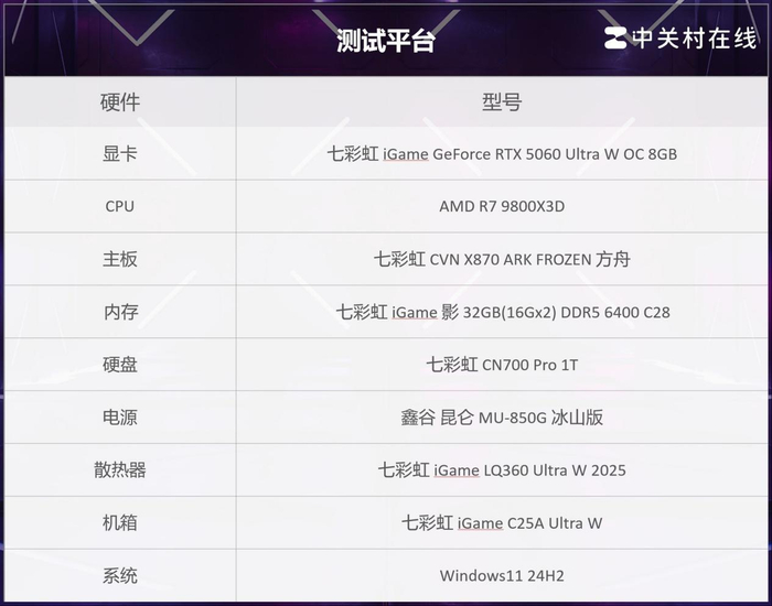 为了解答这个疑问,我们还是得要进行实际测试,显卡方面选择了iGame GeForce RTX 5060 Ultra W OC,考虑到5060不一定能够完全带得动,为此我们还准备了iGame GeForce RTX 5060 Ti Ultra W DUO OC 16GB、iGame GeForce RTX 5070 Ultra W OC 12GB和iGame GeForce RTX 5070 Ti Advanced OC 16GB这两张性能更高的显卡。其他配置如下图所示。