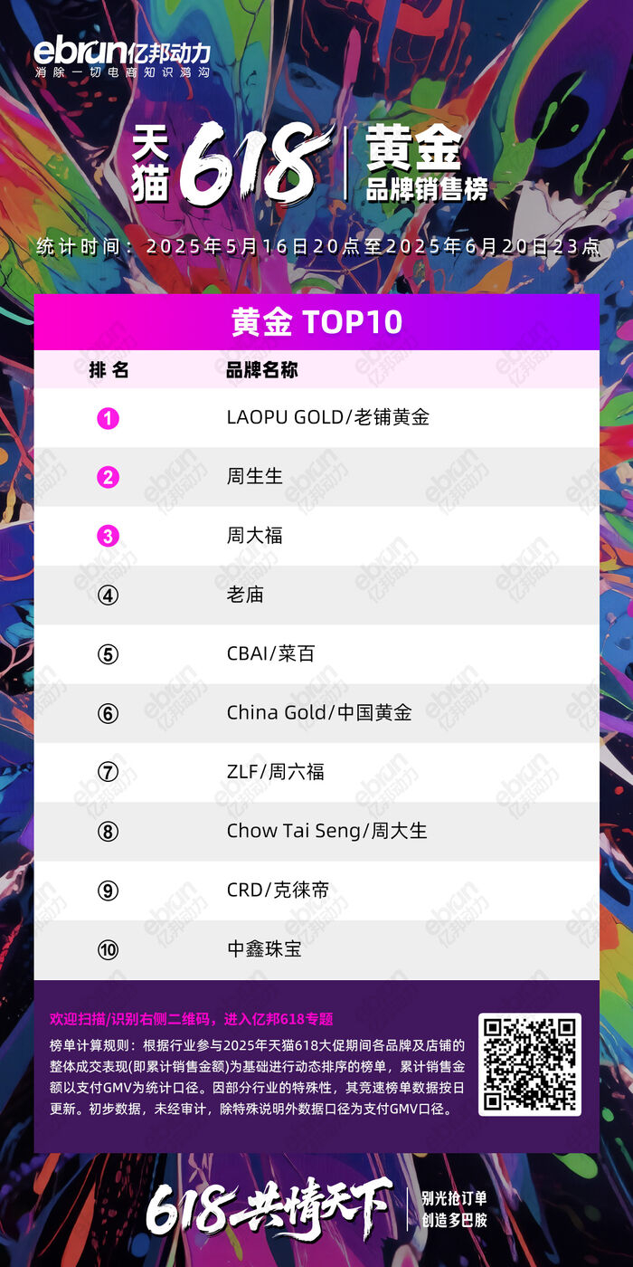 黄金品牌榜的TOP3为老铺黄金、周生生、周大福。据天猫官方公布的数据,老铺黄金成交破10亿。