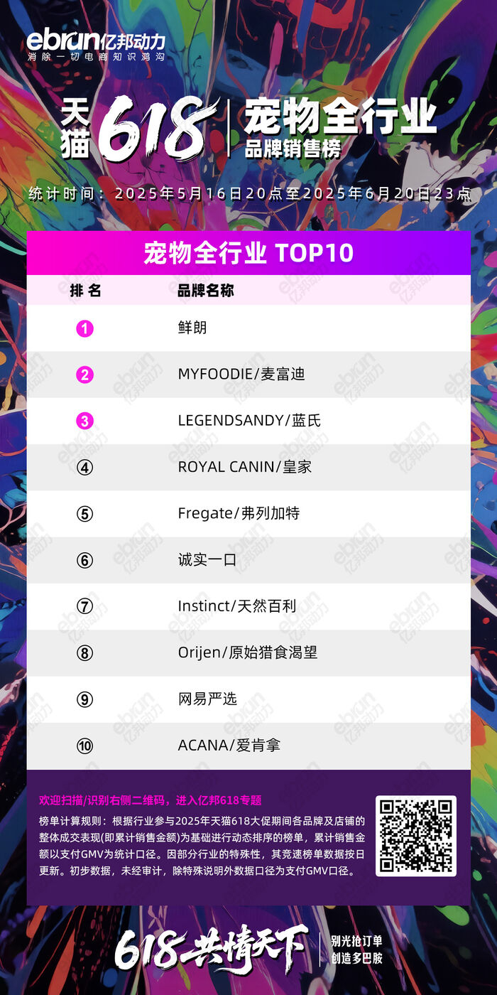 宠物全行业品牌榜的前五名依次为鲜朗、麦富迪、蓝氏、皇家、弗列加特。天猫官方战报显示,鲜朗、麦富迪、弗列加特等6个品牌成交过亿。