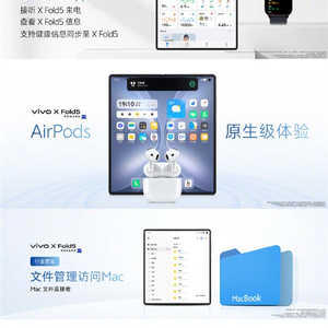 vivo X Fold5支持连接Apple Watch,这也是安卓手机史上第一次,可接听来电、查看信息,甚至同步健康数据到vivo健康应用,同时支持AirPods原生级体验。