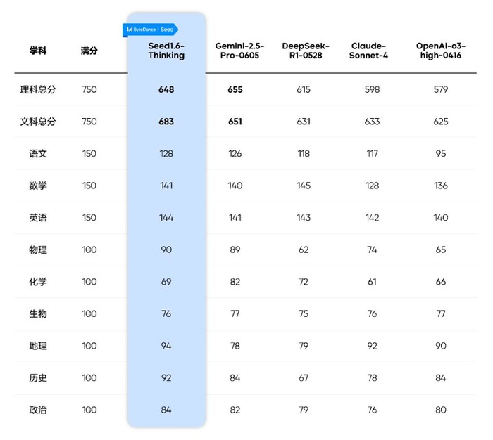 另外,Seed 团队还公布了 2025 高考全科的大模型测试成绩:Google Gemini 2.5 Pro、Seed1.6-Thinking 分别在理科和文科科目上获得 655 分和 683 分的最高分。据悉,该测试采用全国新一卷和山东省自主命题。