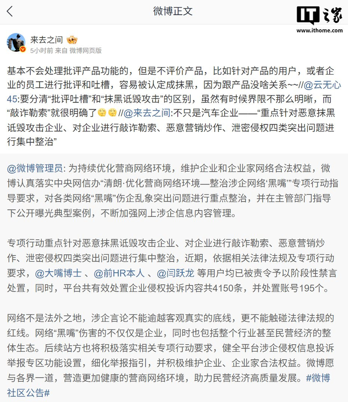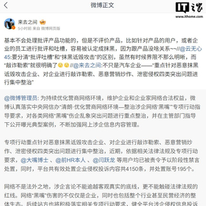 IT之家 6 月 26 日消息,微博管理员账号今日发布消息,为持续优化营商网络环境,维护企业和企业家网络合法权益,微博认真落实中央网信办“清朗・优化营商网络环境 — 整治涉企网络‘黑嘴’”专项行动指导要求,对各类网络“黑嘴”伤企乱象突出问题进行重点整治,并在主管部门指导下公开曝光典型案例,不断加强网上涉企信息内容管理。
