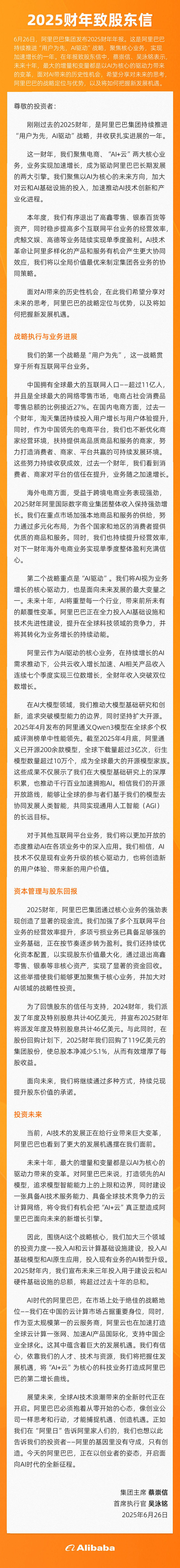 6月26日,阿里巴巴集团(BABA.NYSE/09988.HK)发布2025财年年报,同时,阿里巴巴集团董事长蔡崇信、阿里巴巴集团CEO吴泳铭发布《致股东的信》。