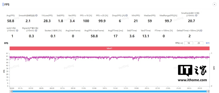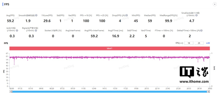 实际进行 30 分钟的跑图加野外战斗,游戏平均帧数来到了 59.2 帧,帧率曲线有一定波动,但大体还是比较平稳的,1% Low 帧也有 29.6 帧。实际游戏中战斗也足够流畅,游戏体验还是能够满足习惯手机触控操作的玩家需求的。