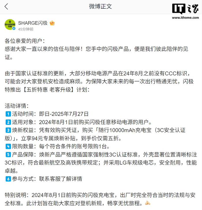 IT之家 6 月 27 日消息,充电宝品牌闪极今日晚间发文称,由于国家认证标准的更新,大部分移动电源产品在 24 年 8 月之前没有 CCC 标识,可能会对大家登机安检造成麻烦。为保障大家未来的每一次出行畅通无忧,闪极特推出【五折特惠 老客升级】计划: