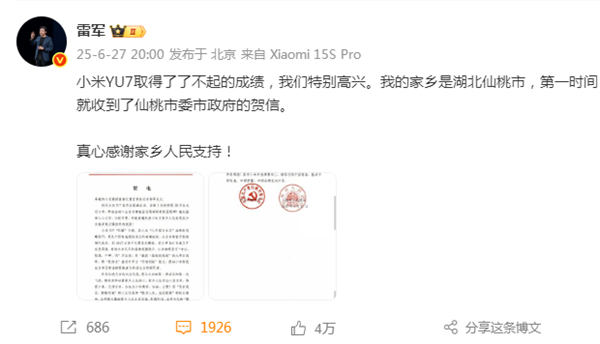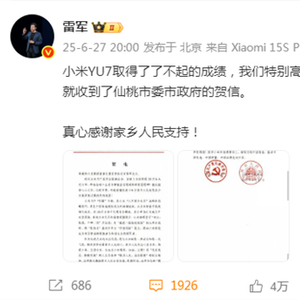 快科技6月28日消息,6月27日晚间,小米集团创始人雷军发布微博:小米YU7取得了了不起的成绩,我们特别高兴。我的家乡是湖北仙桃市,第一时间就收到了仙桃市委市政府的贺信。