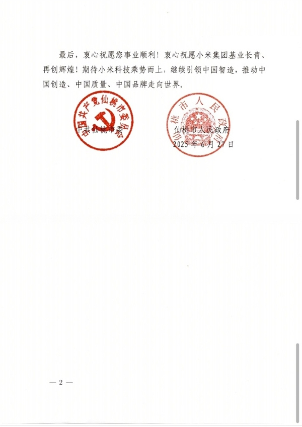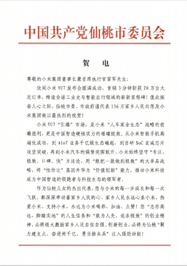 小米YU7创造历史!雷军收到湖北仙桃政府贺电回应:真心感谢家乡人民支持
