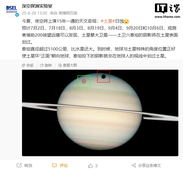 15 年一遇:土星日蚀奇观今夏上演,泰坦阴影划过土星表面