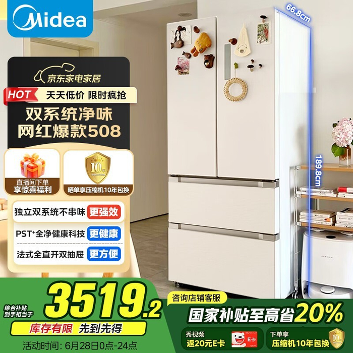 美的508升法式冰箱大容量节能静音一级能效变频家用智能冷藏冷冻