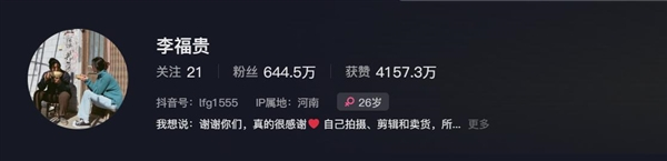 其抖音简介显示,所有视频都是自己拍摄、剪辑和卖货,所以更新有点慢、望大家见谅,商家勿未经同意登门,互相体谅、互相理解、会影响到我和家人的生活。