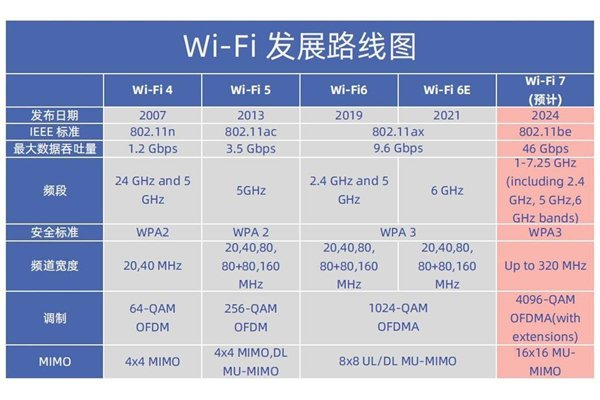随着宽带的不断提速,速率更高的Wi-Fi 6和Wi-Fi 7已成为市场主流。Wi-Fi 6相较于WiFi5,最高支持9.6Gbps的传输速率,几乎达到WiFi5的3倍之多。