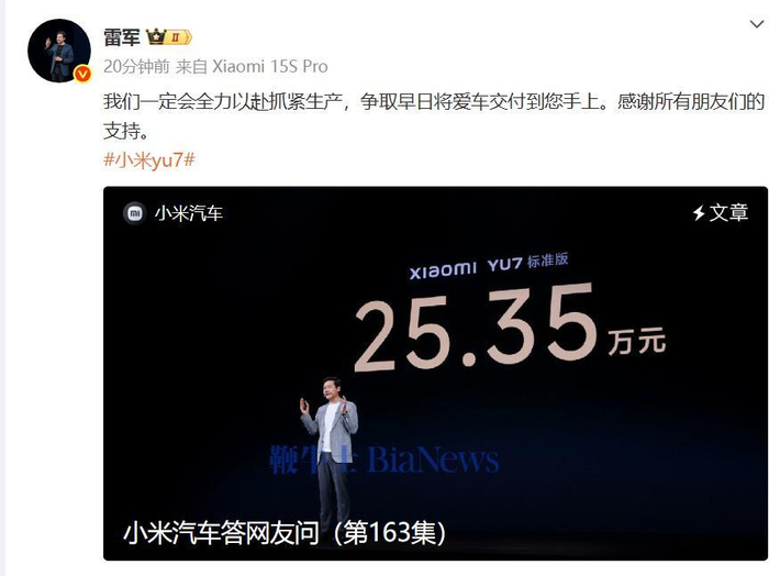 6月29日,雷军转发《小米汽车答网友问》时表示,一定会全力以赴抓紧生产,争取早日将爱车交付到车主手上,并“感谢所有朋友们的支持”。