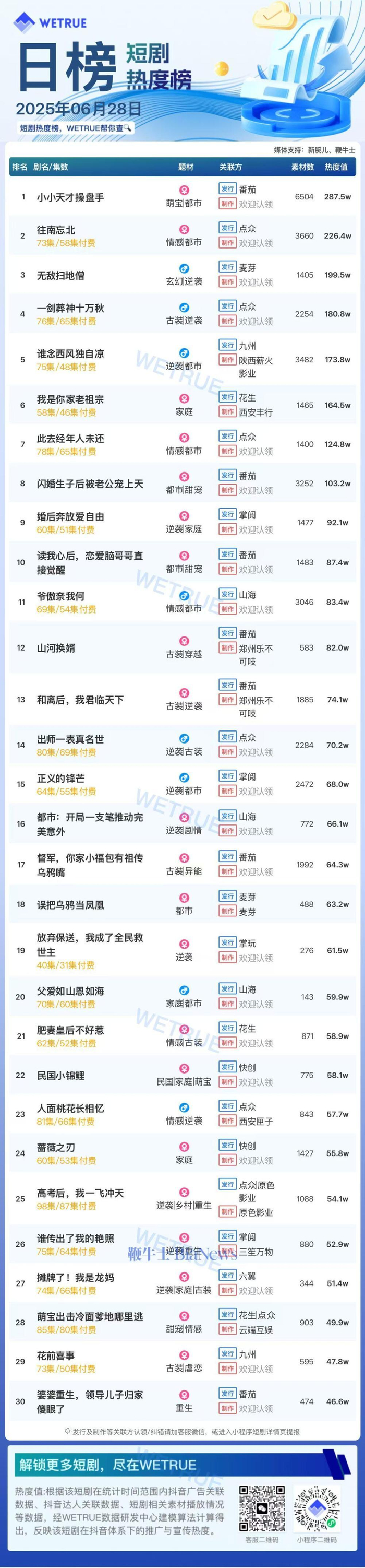 1、本日榜为WETRUE短剧数据公司提供,新腕儿和鞭牛士提供联合支持。