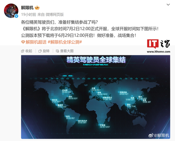 IT之家 6 月 29 日消息,西山居机甲游戏《解限机》官方微博今日宣布,本作将于北京时间 7 月 2 日 12:00 正式开服,公测版本预下载于今日 12:00 开启。