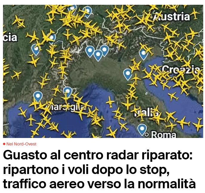 IT之家从报道获悉,出于安全考虑,西北区域所有航班暂停起降,超过 300 个航班受到影响。已在空中的飞机被改道至其他目的地,即将起飞的航班则被延误。一个半小时后,首批航班重新起飞,与此同时,意大利国家航空服务公司(Enav)的技术人员正在努力使系统完全恢复正常。