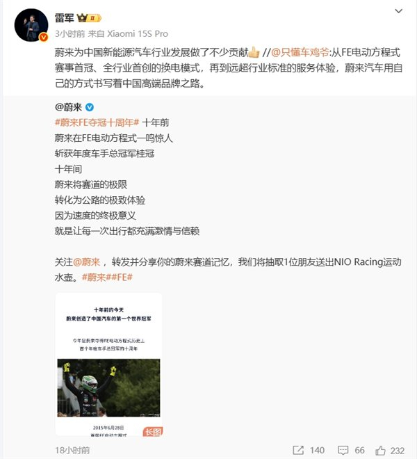 雷军今日转发并称赞:蔚来为中国新能源汽车行业发展做了不少贡献。