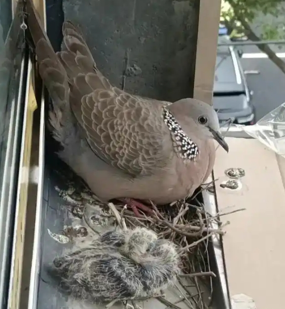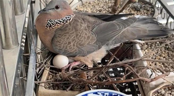 珠颈斑鸠则不同,它们丝毫不讲究自己的巢穴,哪里都可以筑巢,再潦草的巢也能下得去蛋,材料更是不讲究,能捡到什么就是什么。