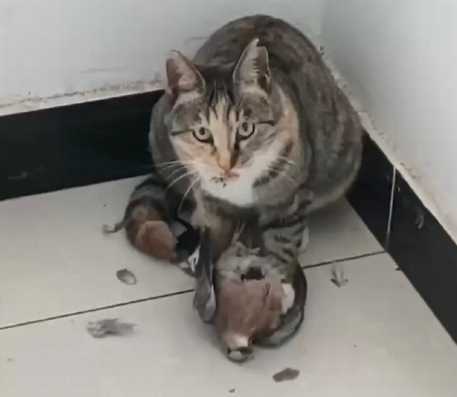 这种鸟绝对算不上聪明,非常容易被猫这种城市“鸟类杀手”抓到,胆子还小的一批,被抓了就认命。