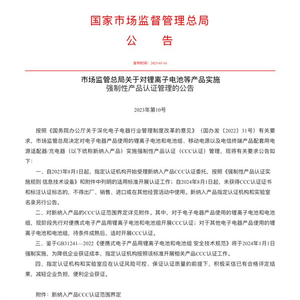 实际上,我国对充电宝产品的3C认证管理是从2023年8月才开始。国家市场监督管理总局于2023年3月14日发布的公告显示,“决定对电子电器产品使用的锂离子电池和电池组、移动电源以及电信终端产品配套用电源适配器/充电器(以下统称新纳入产品)实施强制性产品认证(CCC认证)管理”,要求“自2023年8月1日起,指定认证机构开始受理新纳入产品CCC认证委托” ,且“自2024年8月1日起,未获得CCC认证证书和标注认证标志的,不得出厂、销售、进口或在其他经营活动中使用”。