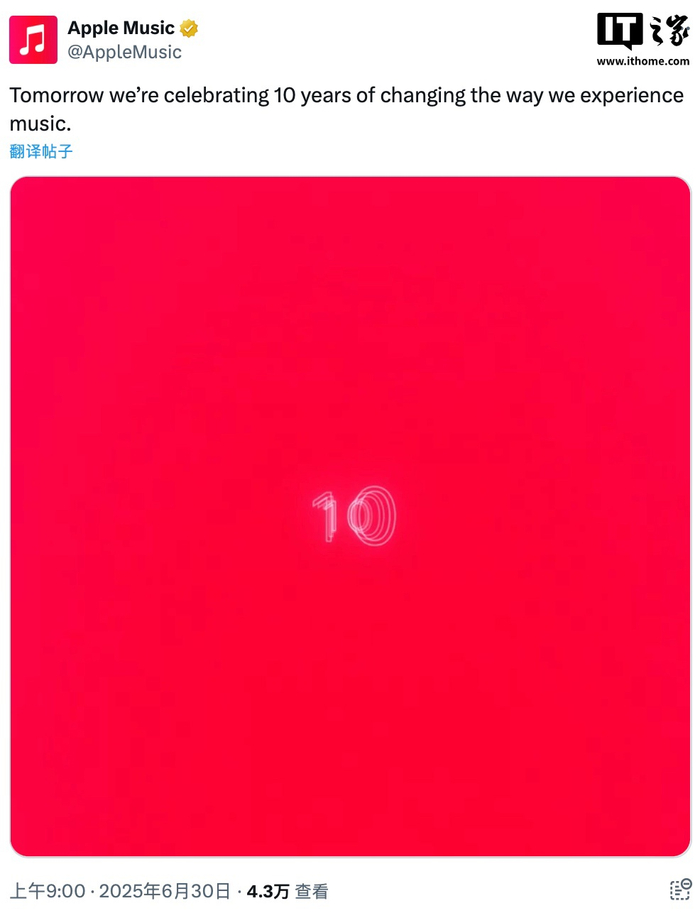 IT之家 6 月 30 日消息,苹果 Apple Music 今日于 X 平台发文,宣布该服务诞生 10 周年,将于明日举行“音乐体验方式改变十周年”活动。