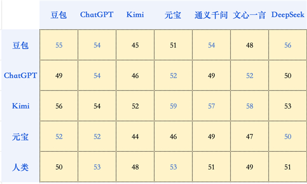 根据这个不完全统计,模型并没有表现出对自家作品的特殊偏爱,有时候反而可能给自己打低分——比如元宝的作文,在人类和其他模型的横评中,都取得了很高的分数,但在自己的评测中,反接近最低分了。