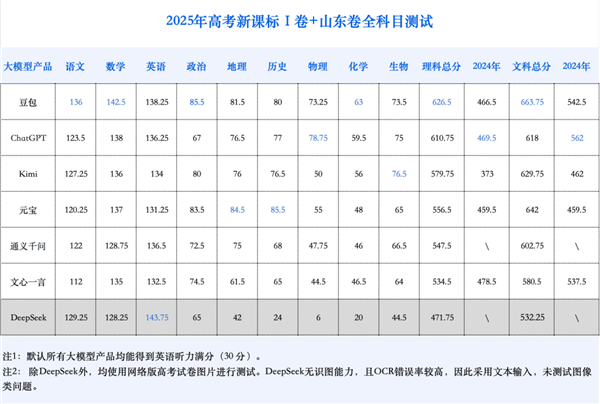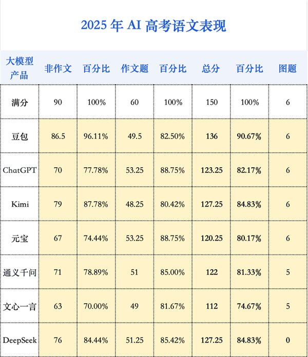 然而在本应是其「主场」的英文科目上,它却不敌「中国考生」——DeepSeek 在选择题上甚至拿了满分,而最终总成绩上,DeepSeek 也与豆包一同超越了 ChatGPT。