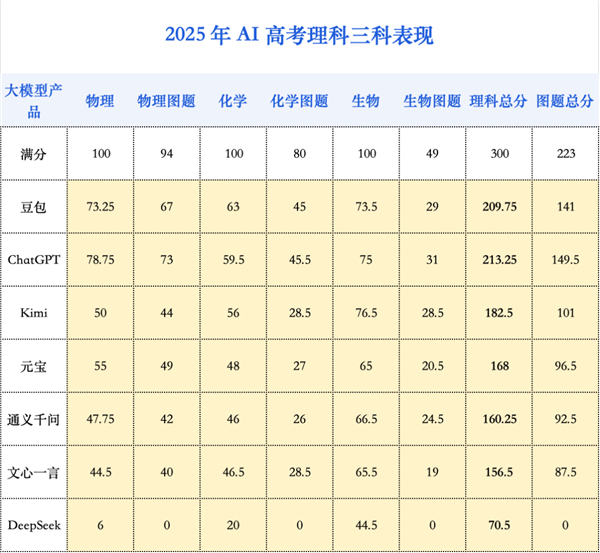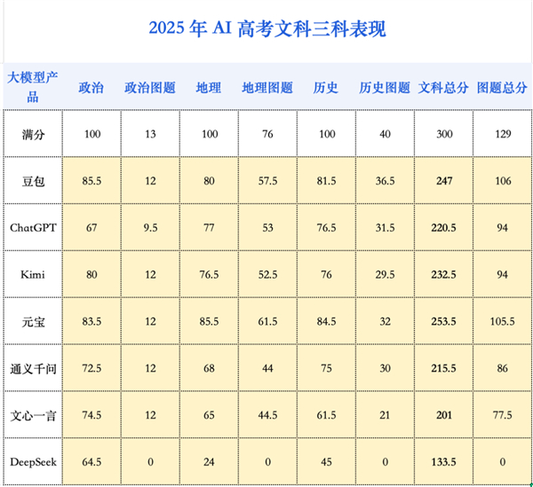 早在去年,ChatGPT 就已拿下文综 237 分的高分。而今年, 元宝更是将文综最高分推升至 253.5 分 ,这一成绩,与理科综合最高分(213.25 分)形成了鲜明对比。