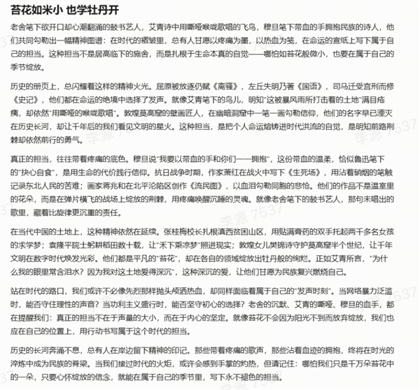 比如这篇文章的中间几段,先是提出「历史上闪耀着这样的精神火光」的观点,随即并列引用三到四位历史人物;接着,引出「真正的担当带着疼痛的底色」的论点,再列举三到四位经历苦难的人物;最后,论及当代精神,再次列举三到四个当代人物。