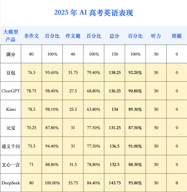 而高考英语这张试卷,本身远未触及母语者的语言天花板,且相较于包含古文的语文,其客观题占比更高、作文要求更简(仅 80 词),也并不追求立意高远,理论上是 AI 更容易获得绝对优势的战场。