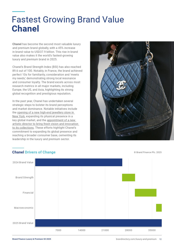 这一增长使香奈儿从第三位跃升至全球50大最具价值奢侈和高端品牌第二位,品牌价值达379亿美元,超越路易威登(品牌价值仅增长2%,达到329亿美元)。