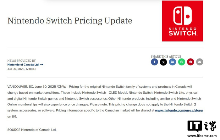 IT之家 7 月 1 日消息,任天堂宣布,由于“市场条件”,公司将在加拿大提高多款产品及服务的价格。