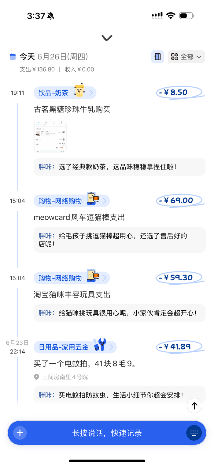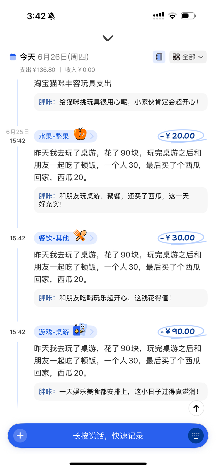 我故意给小胖咔提升了难度:不仅让它补记昨天的账,还一口气报了好几项消费,没想到这也难不住它。