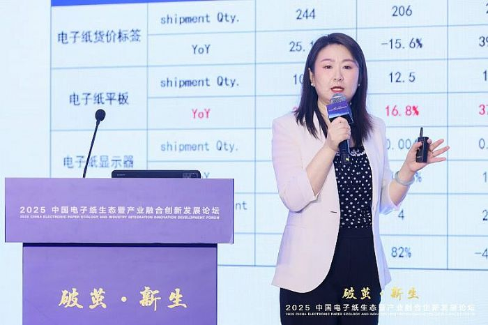 洛图科技COO王育红带来了题为《电子纸显示技术主要应用终端发展趋势报告》的市场解读。其中,不少细分市场的数据在报告中首次公开。2024年,电子纸技术显示产值规模超142亿美金,跻身全球各新型显示技术的前列,同比2023年的增幅为29%。预测2025年全球电子纸智慧零售端价签出货量将达3.6亿片,电子纸平板出货量近1900万台。以电子纸价签,电子纸阅读器,电子纸办公本为代表的品类脱颖而出,形成“2+1+N”的应用终端场景化生态布局。在中国市场,预计2025年中国电子纸平板市场的出货量为310万台,增速超过30%,远高于全球9.3%的水平。她总结到,电子纸显示是具有时代使命感的创新显示技术,未来会在更多元的场景下展现创新的应用。