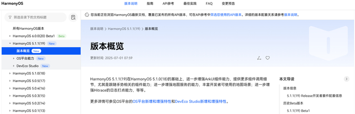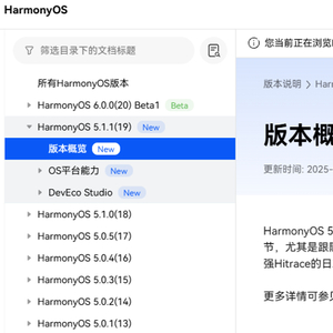 系统 | Release | HarmonyOS 5.1.1 Release | 软件版本:5.1.0.202 API 版本:5.1.1 (19) | 2025/06/30 |