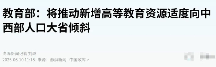 日前,教育部表示,将推动新增高等教育资源适度向中西部人口大省倾斜。