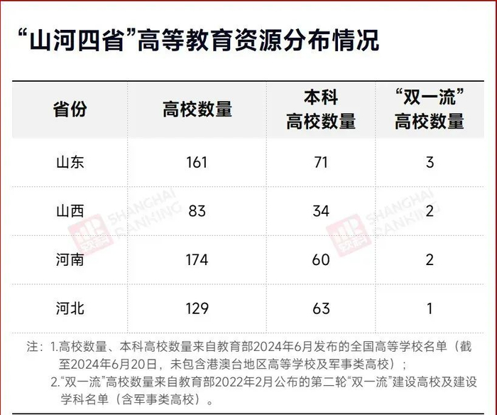 山东、湖北、北京、浙江、辽宁、河北紧随其后,而河南本科院校数量仅排第九。