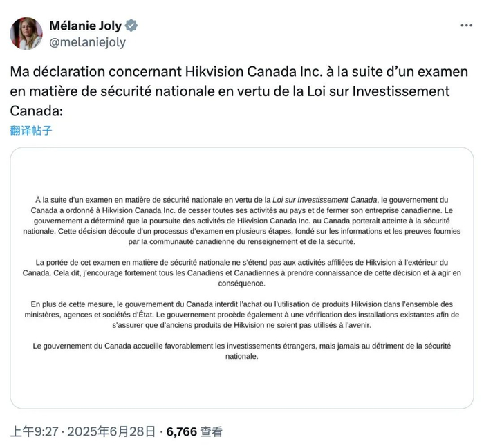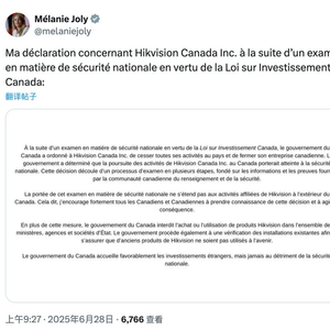 加拿大工业部长梅拉妮·乔利(Melanie Joly)在社交平台上发布声明称,根据《加拿大投资法案》进行审查后,加拿大政府已认定海康威视加拿大公司(Hikvision Canada Inc.)继续在该国运营将“损害加拿大的国家安全”,海康威视加拿大有限公司被勒令需要在120天内停止在加所有运营并关闭其加拿大业务。