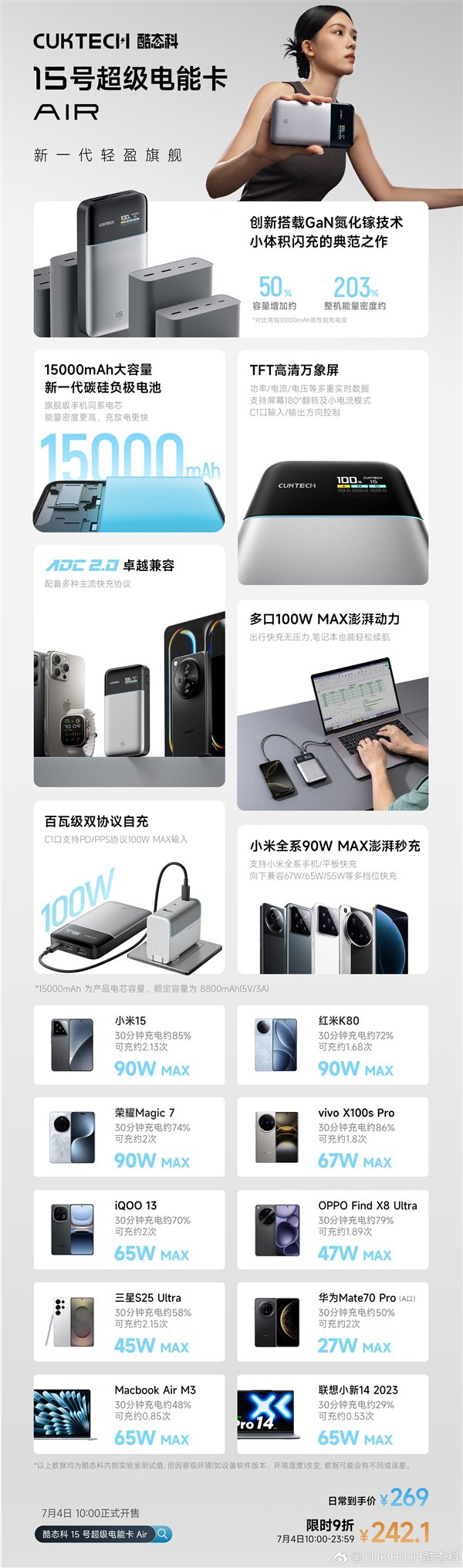 快科技7月2日消息,酷态科正式发布了15号超级电能卡Air,官方定价269元,收发限时9折,到手价242.1元。