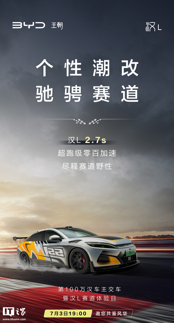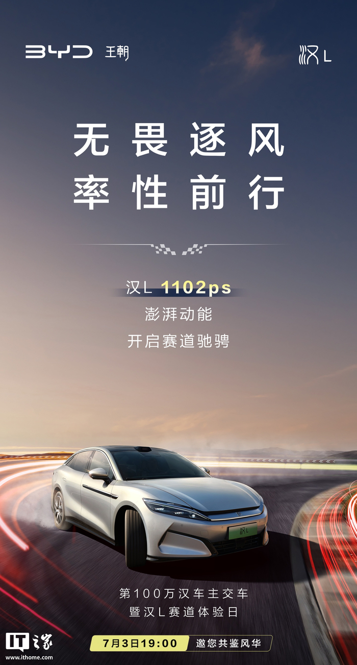 IT之家 7 月 2 日消息,比亚迪汽车官宣,第 100 万汉车主交车暨汉 L 赛道体验日活动将于 7 月 3 日 19:00 举行,并放出了三张海报。