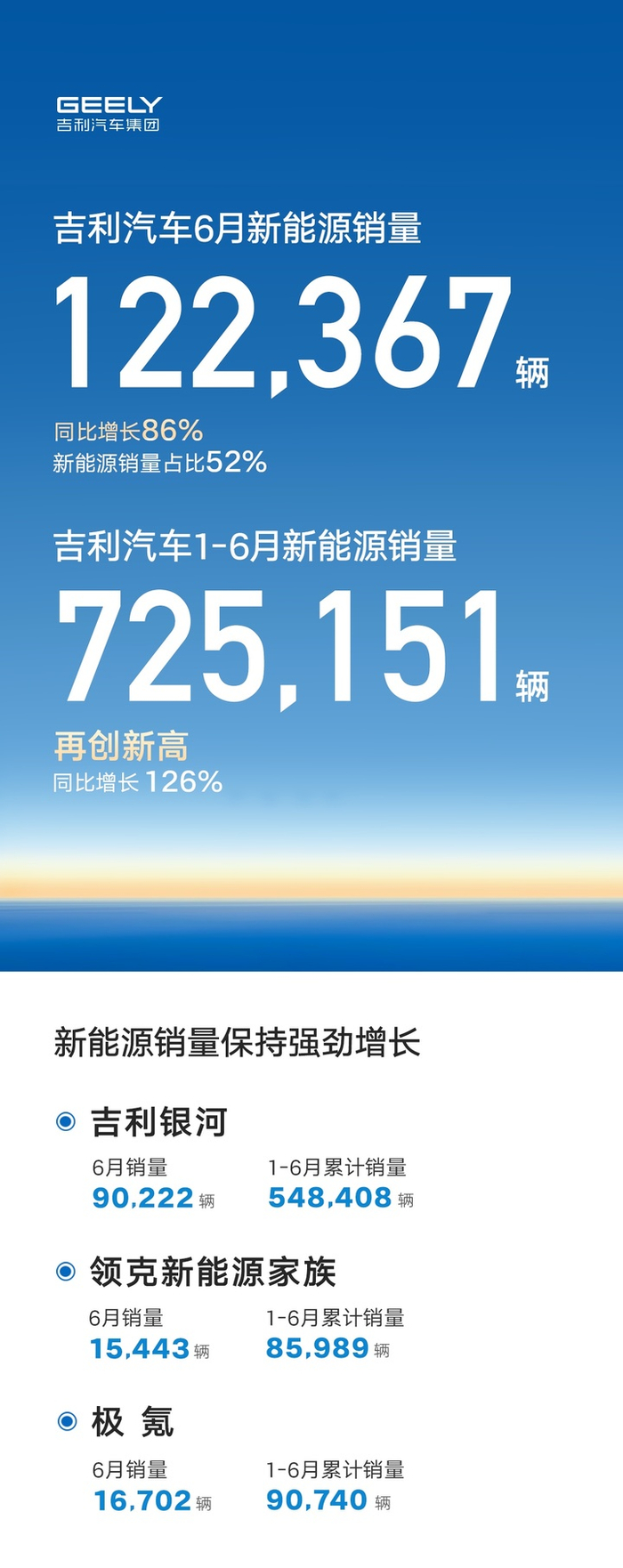 吉利新能源 6 月份销量为 122367 辆,占整个吉利集团的 52%。新能源上半年累计销量为 725151 辆,比去年同期增长了 126%,吉利同时上调了 25 年的新能源销量目标至 300 万辆。