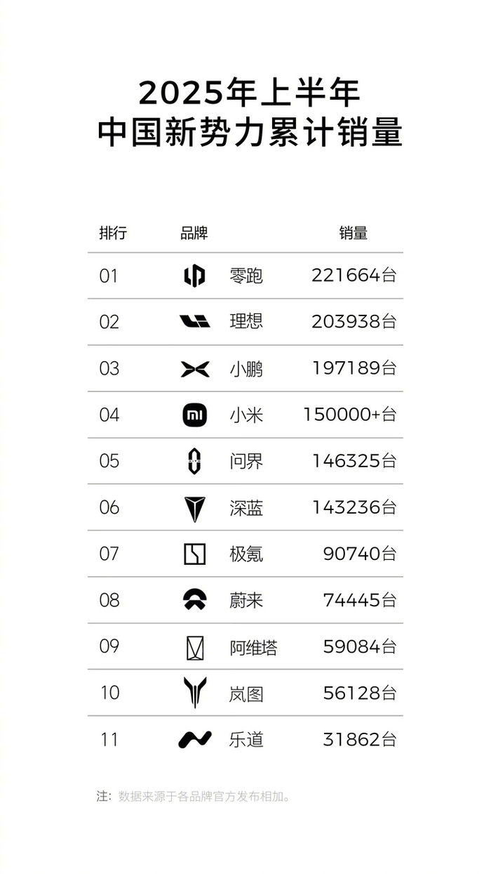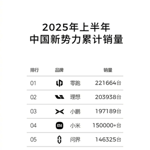 新势力中,零跑、理想、小鹏分别以 22 万辆、20 万辆和 19 万辆占据了上半年销量榜前三,小米和问界分别以 15 万辆和 14.6 万辆的成绩分列第 4 第 5。