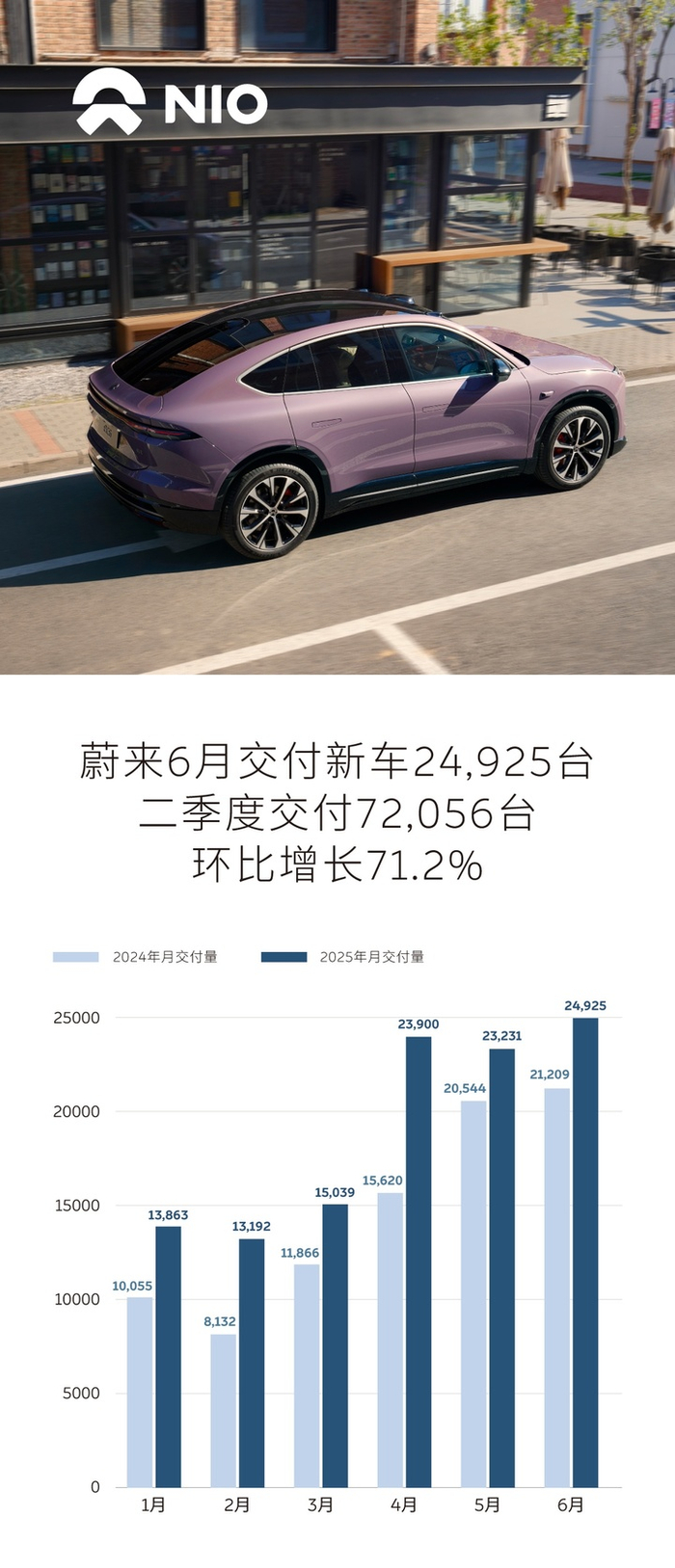 2025 年 6 月,蔚来一共交付了 24925 台新车,其中蔚来品牌 14593 辆,乐道 6400 辆,firefly 萤火虫 3932 辆。整个上半年,蔚来累计交付了 114150 台车,完成了 全年 44 万辆目标中的 25%。